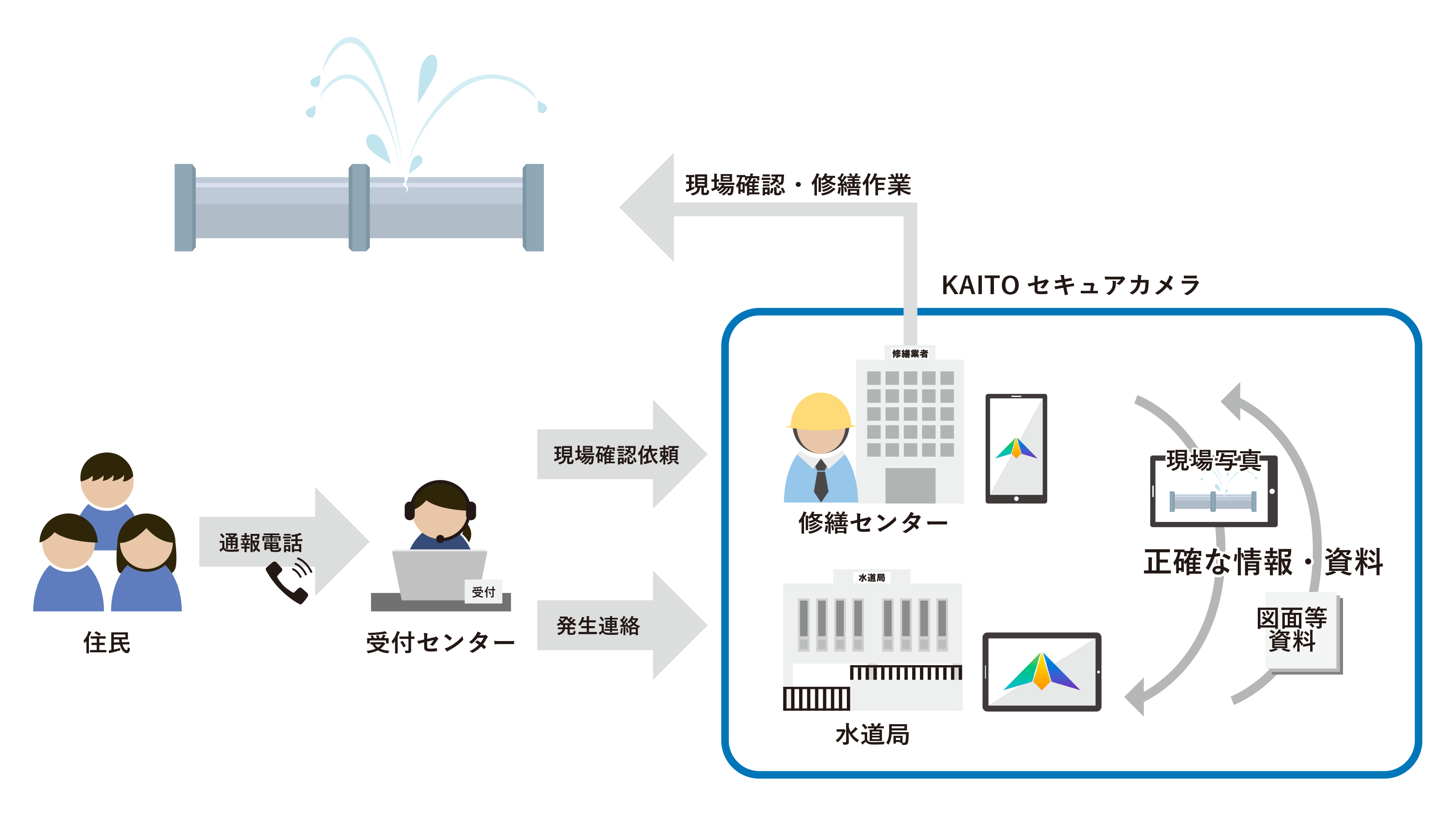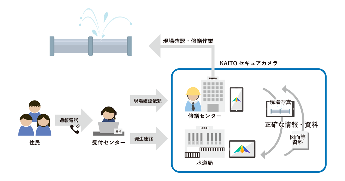 従来、電話やFAXにて行われていた水道局と修繕委託業者間のやり取りが、現場担当者のモバイル端末にインストールしたKAITOセキュアカメラアプリを使うことでリアルタイムに双方向で共有でき、漏水状況による緊急性の判断・修繕に必要な図面の共有など修繕完了までに発生する各手順の時間と手間が大幅に削減されました。