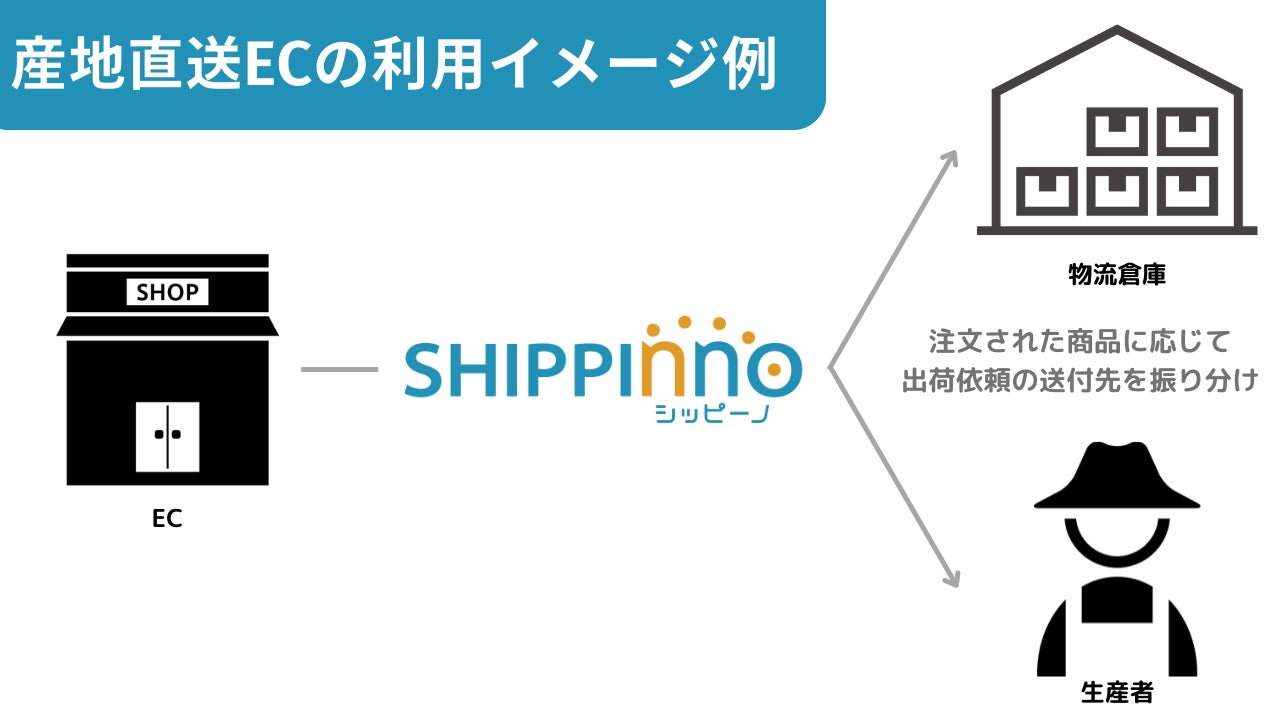 シッピーノには商品のSKUに応じて、出荷依頼を送付する先を選ぶ機能があるため、物流倉庫での保存が可能な商品はAPI連携で物流倉庫に出荷依頼を共有し、生鮮食品は農家さん宛てにCSVで出荷依頼を共有しています。CSVの出力とメールでの送付もシッピーノが自動で処理しています。