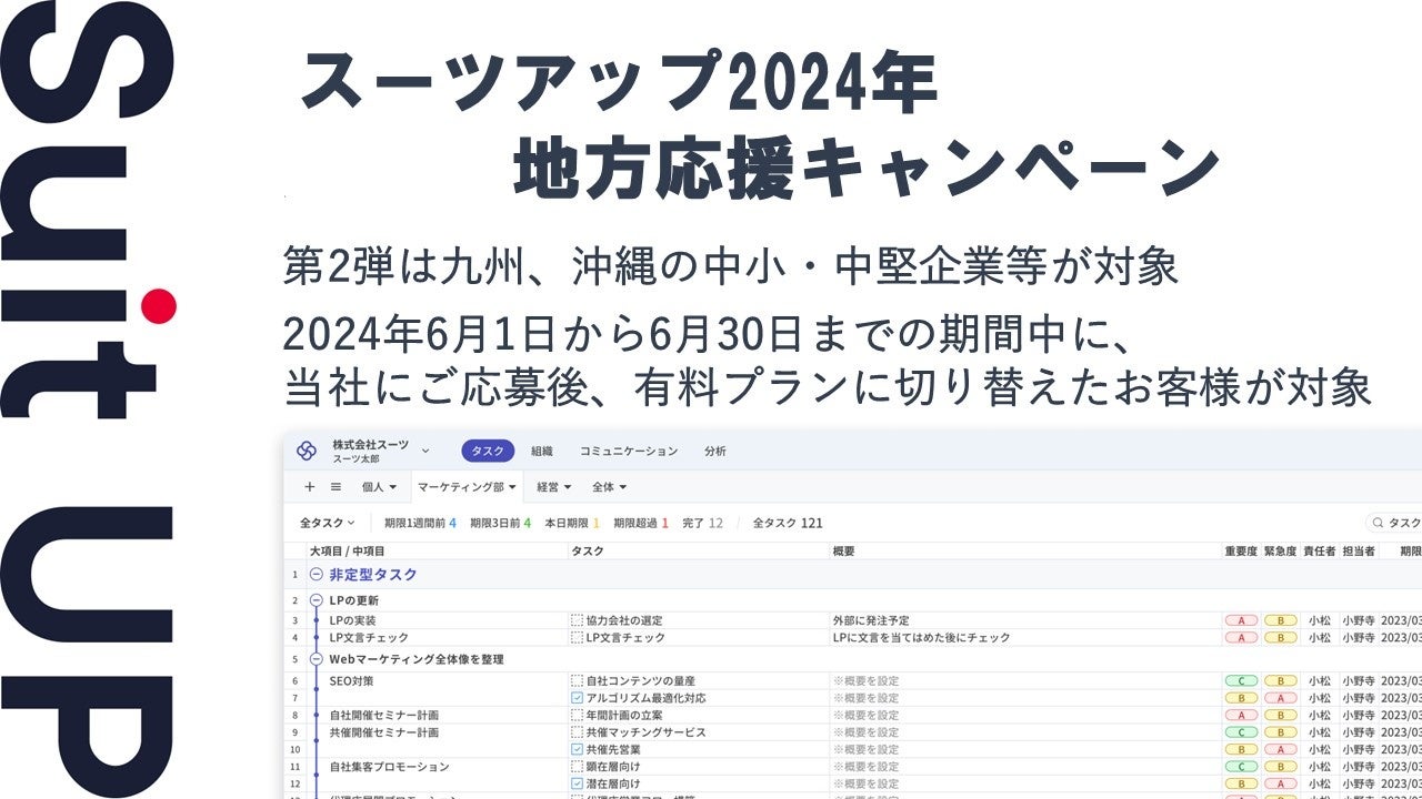 この度、株式会社スーツ(所在地:東京都千代田区、代表取締役社長CEO:小松 裕介)は、「スーツアップ2024年地方応援キャンペーン」第2弾として、九州(福岡県、佐賀県、長崎県、熊本県、大分県、宮崎県、鹿児島県)、沖縄県の社員数100名未満の中小・中堅企業、スタートアップを対象に割引キャンペーンを実施いたします。