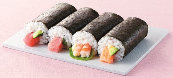 具 材:左から「まぐろきゅうり中巻」「まぐろたたき中巻」「えびサラダ中巻」「サーモンたたきサラダ中巻」お子様にも食べやすいサイズをご用意しました。