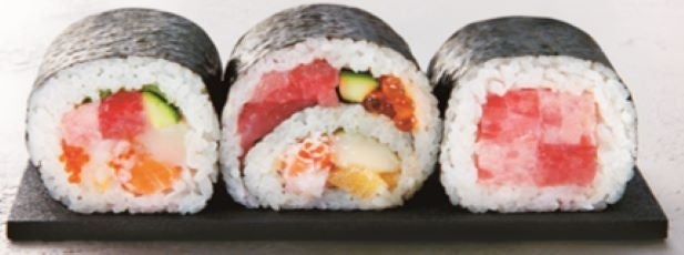 具 材:左から「一番人気!豊漁八宝海鮮巻」「匠の海鮮巻」「市松模様のまぐろ巻」1本の1/3サイズをセットにしました。