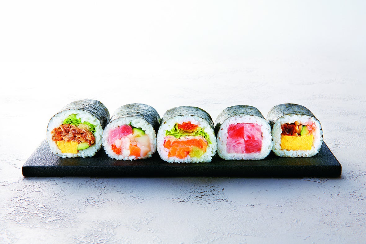 具 材:左から「柿安監修 国産牛しぐれ煮恵方巻」「一番人気!豊漁八宝海鮮巻」「ごまマヨソースのサーモンサラダ巻」「市松模様のまぐろ巻」「福を呼び込む!招福恵方巻」
