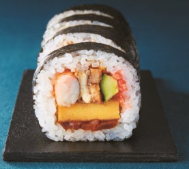 具材:海老入り玉子焼き、しいたけ煮、焼き穴子、煮穴子、車えび、 海老入りおぼろ、かんぴょう煮、きゅうり、煮詰めたれ、わさび