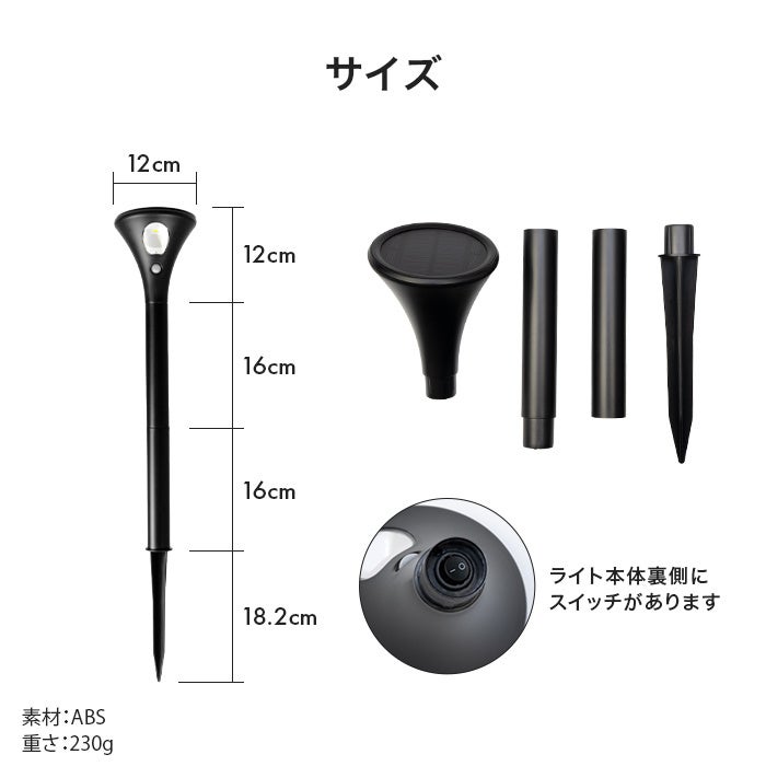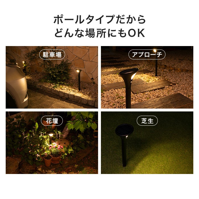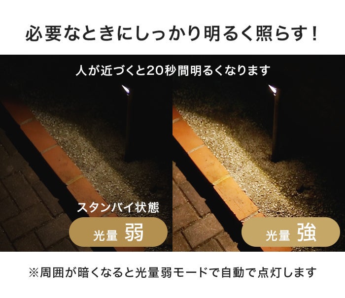 人感センサー搭載のポール型ソーラーライト。家族の安全を守るため、家の外側を明るく照らします。家に帰るとき、足元が暗くてつまずいたり、ケガをしたりする危険を解消します。