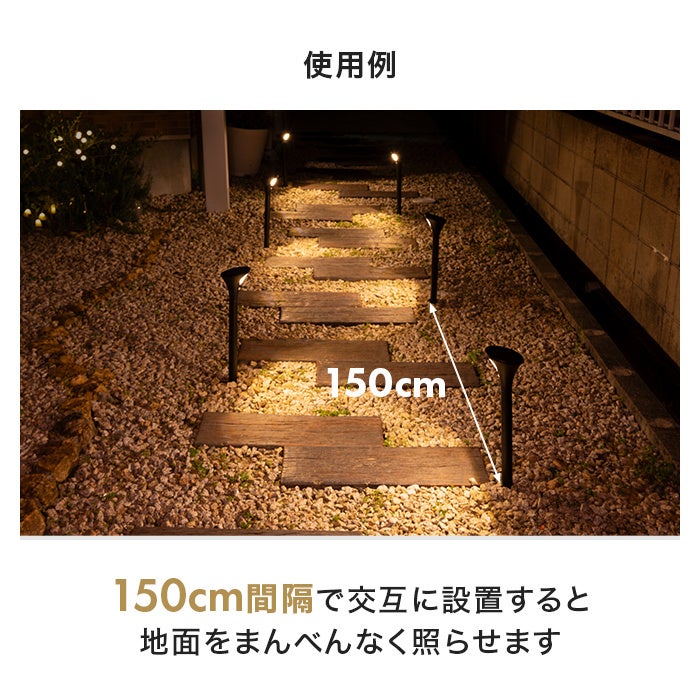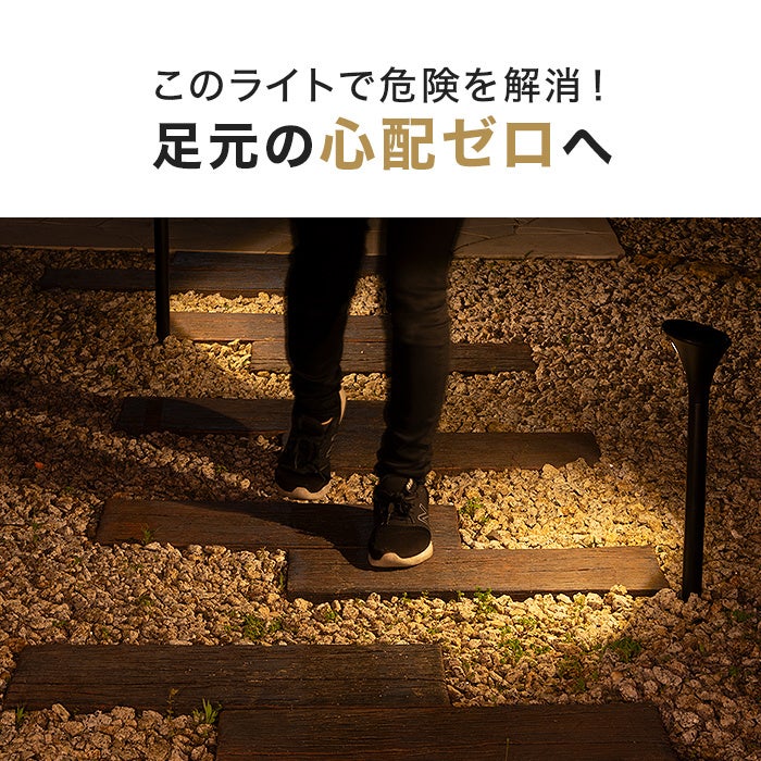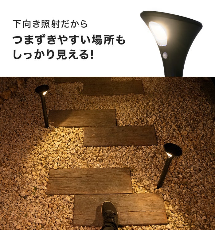 下向きに地面を照らすので、足元をしっかりと明るく照らします。つまずきやすい場所もしっかりと見えるようになるので、お子様やご高齢の方の安全にも最適です。