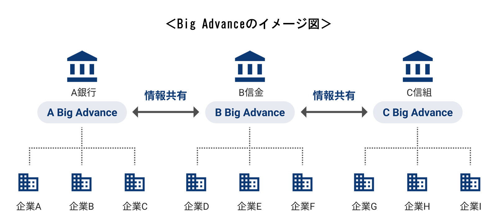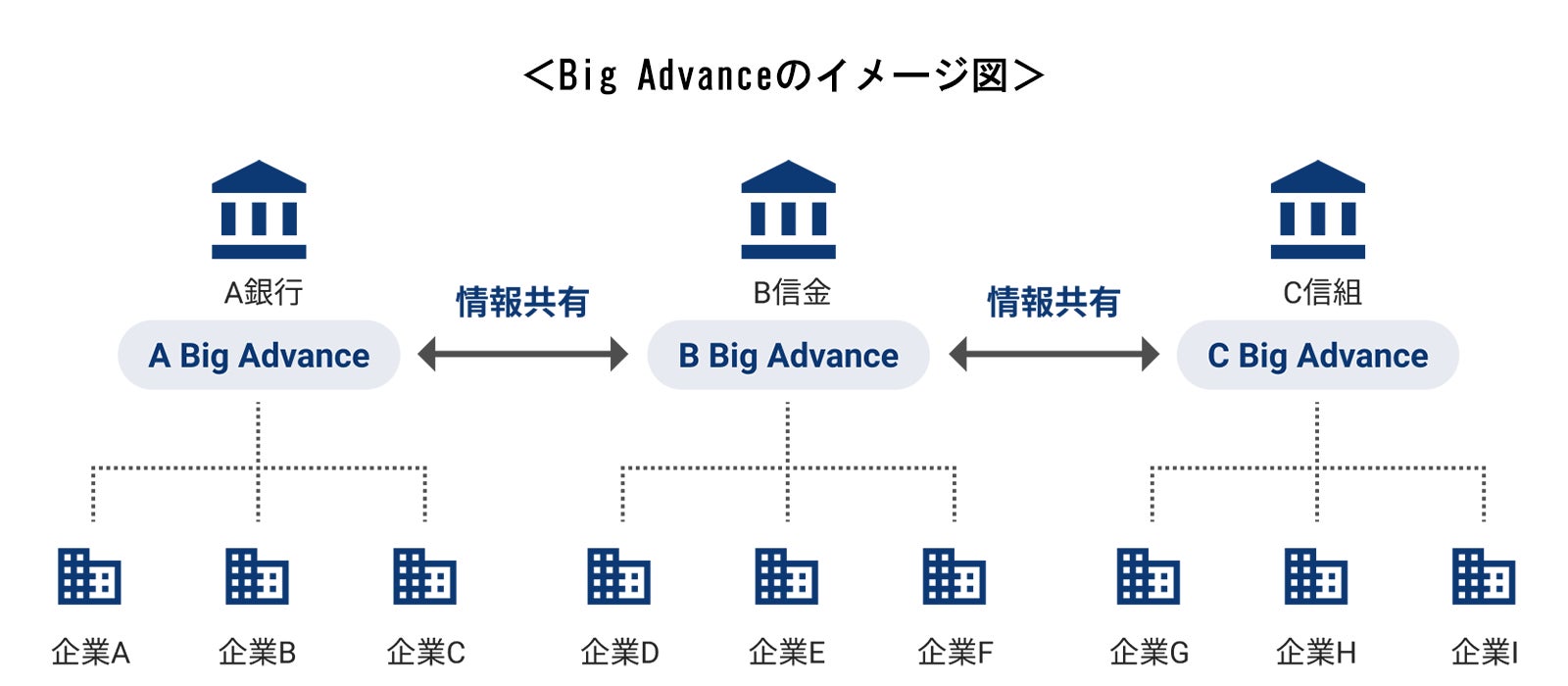 中小企業DX支援プラットフォームである「Big Advance」は、現在80以上の金融機関が運営しており、その取引先企業が利用できるサービスです。