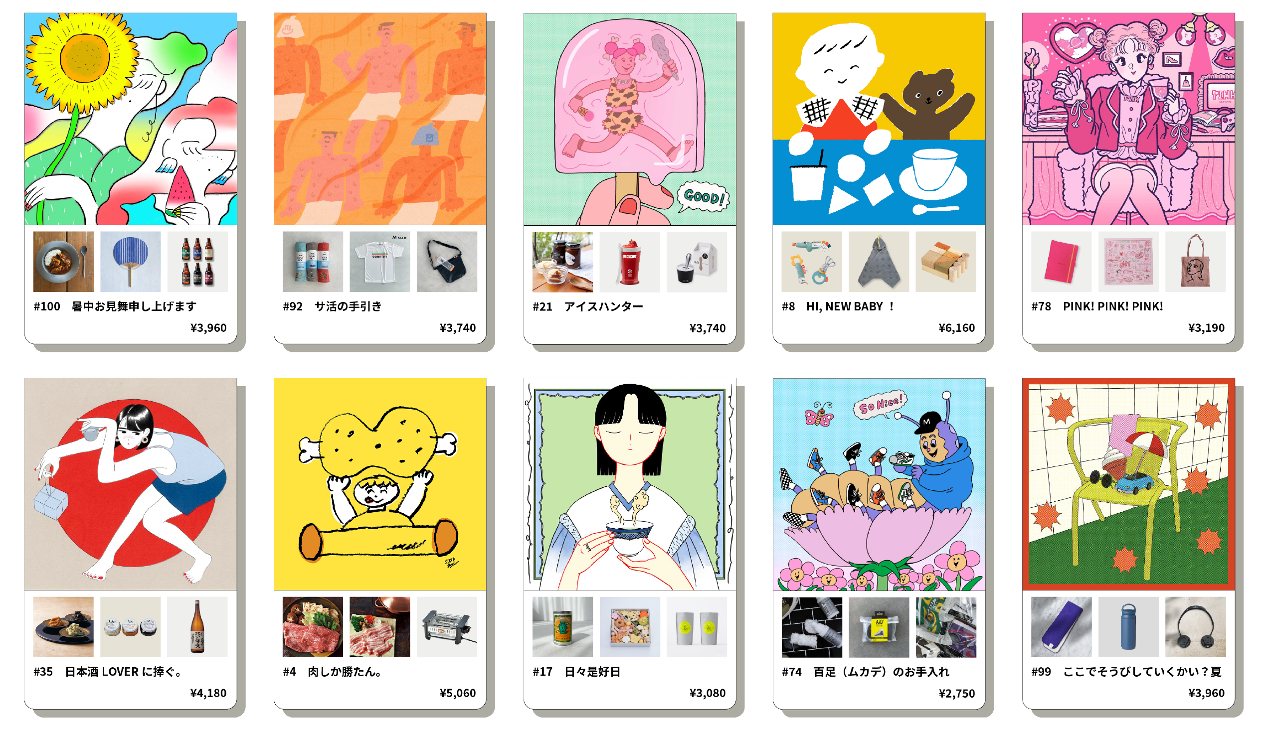 各テーマで相手が選べる5商品は、ターゲット世代である20代のバイヤーが厳選。また、「ソーシャルギフトは味気ない」と思っている人にも楽しんでもらえるよう、50名余りのイラストレーターとコラボし、テーマごとに異なるイラストデザインのメッセージカードをご用意しました。