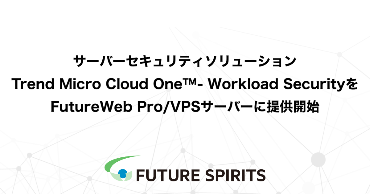 株式会社フューチャースピリッツ(本社:京都府京都市下京区、代表取締役 谷孝 大、以下フューチャースピリッツ)は、Trend Micro™社のサーバーセキュリティソリューション「Trend Micro Cloud One™ - Workload Security」(以下、C1WS)を、フルマネージドホスティングサービスのFutureWeb Pro/ FutureWeb VPSサーバーに提供を開始。