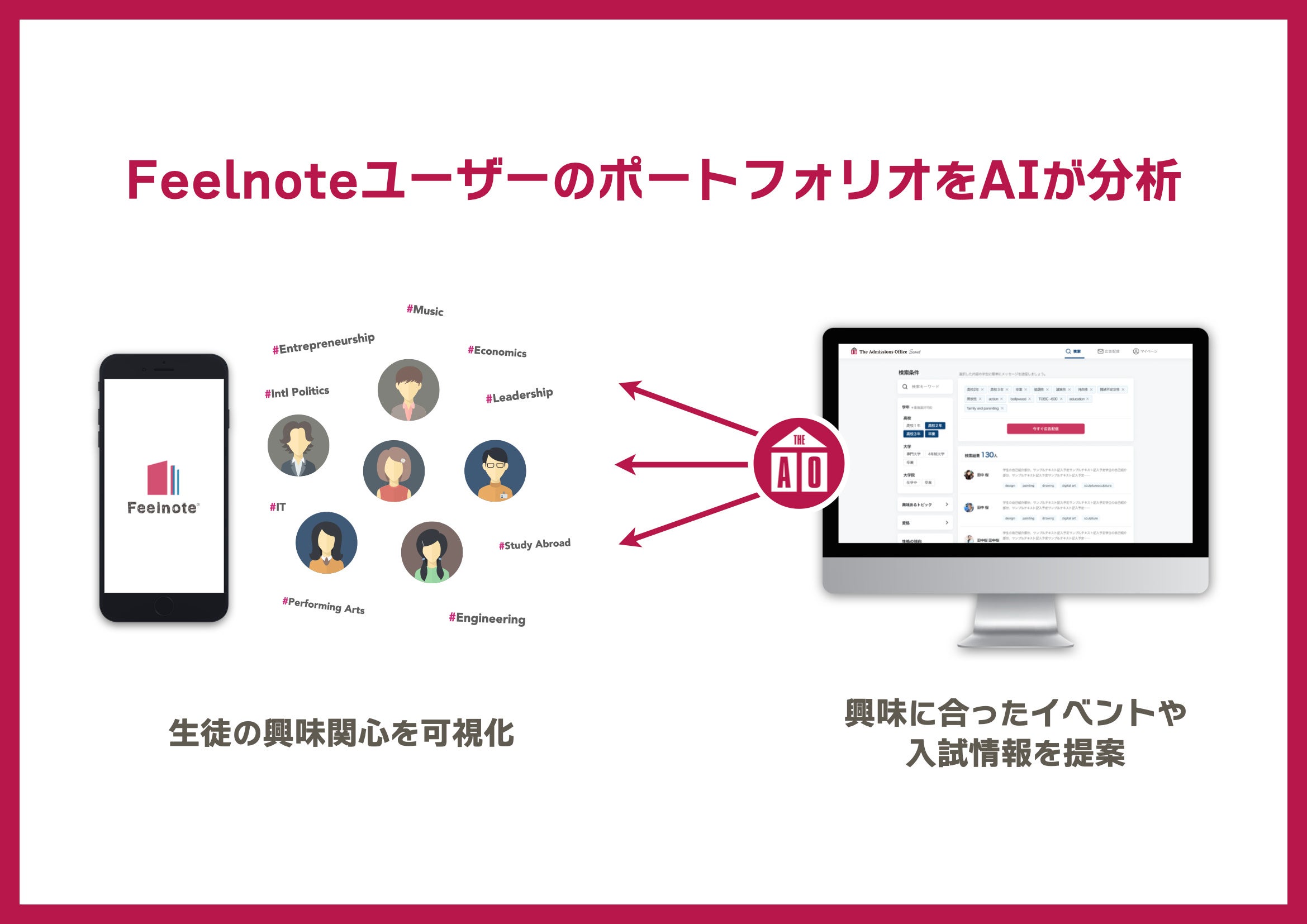 TAO SCOUTは、ポートフォリオAI分析によって可視化されたFeelnoteユーザーの個性を参照して情報配信を行うことができるTAO導入大学向けのサービスです。これにより、一人ひとりの興味関心に合った情報を届けることができ、生徒のやりたいことと大学の求める人財像とのマッチングが推進されることが期待できます。