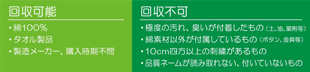 不要になってしまったタオルがありましたら、この機会に回収ボックス設置店舗にお持ちくださいませ。
