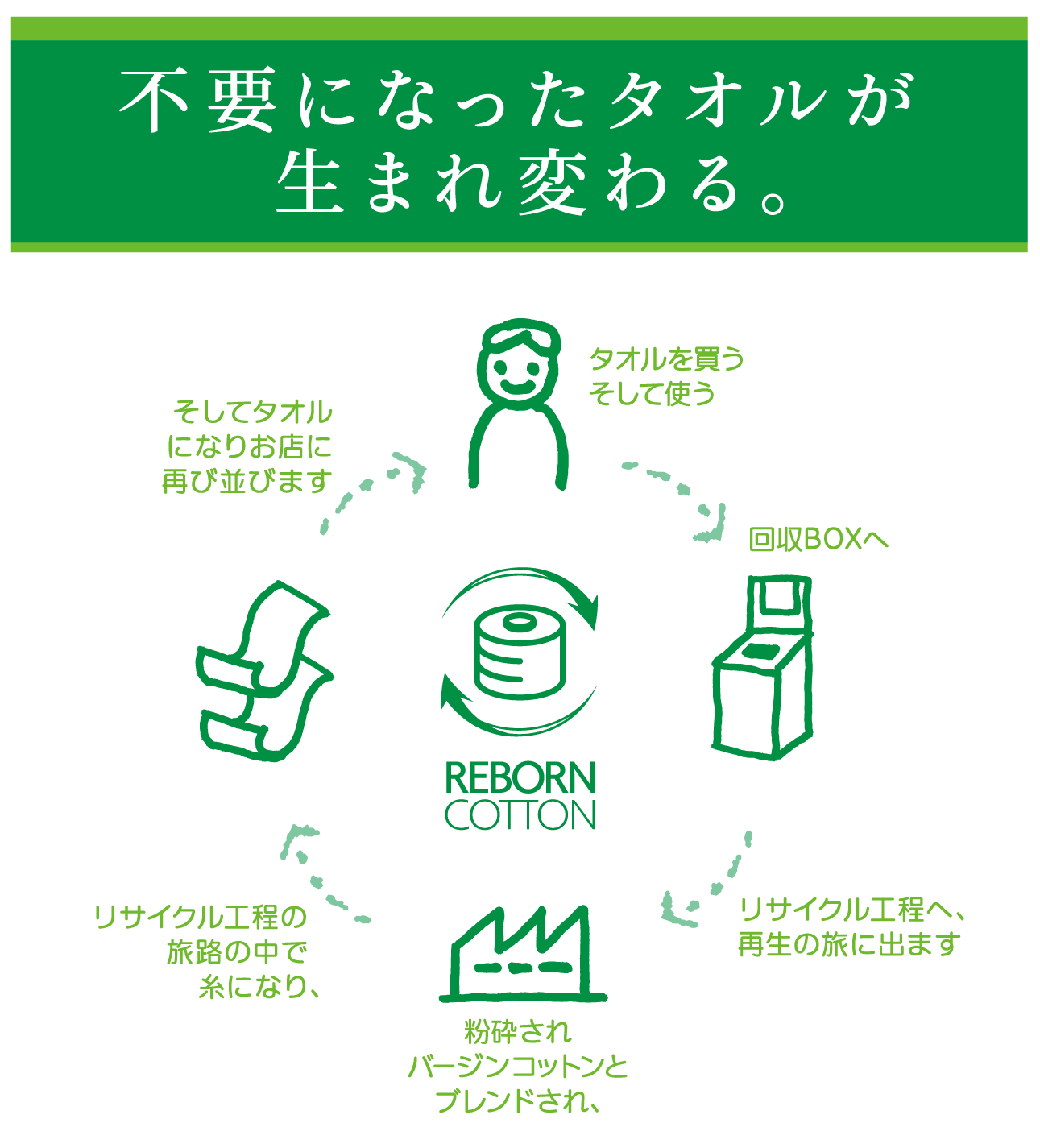 不要になった使用済みタオルや工場から出るタオルの廃材を回収し、粉砕・反毛といった工程を経て再生繊維にした後、バージンコットンと合わせて紡績することで再生糸となる。その再生糸を使用した新しいタオル製品を製造することで、廃棄物の量を削減すだけでなく、半永久的にタオルのリサイクルが可能となり、サーキュラーエコノミーの実現に貢献する。
