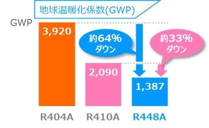 R448 Aは次世代冷媒ともよばれ、地球温暖化係数(GWP)が従来の冷媒R404Aと比較して約64%、R410A比では約33%低減した冷媒です。これにより、フロン排出抑制法に基づく環境影響度の目標達成度「A」を達成しました。