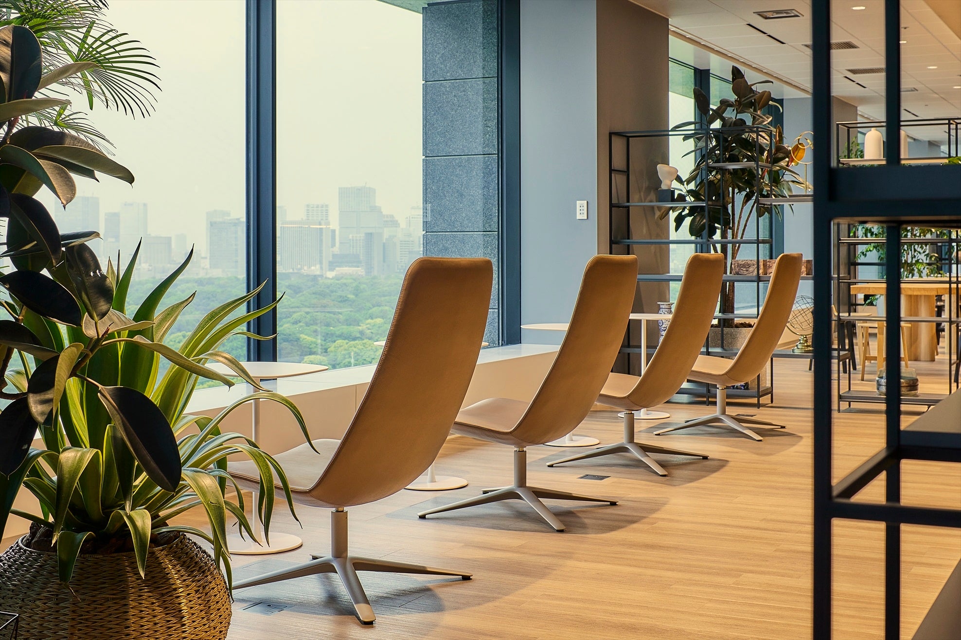カッシーナ・イクスシーは、2021年5月に東京・大手町へと移転した丸紅新社屋において、9階から20階にわたる執務フロアの“Round”スペースの設計・施工、ならびに家具からインテリアアクセサリーまでトータルでデザイン監修を行いました。