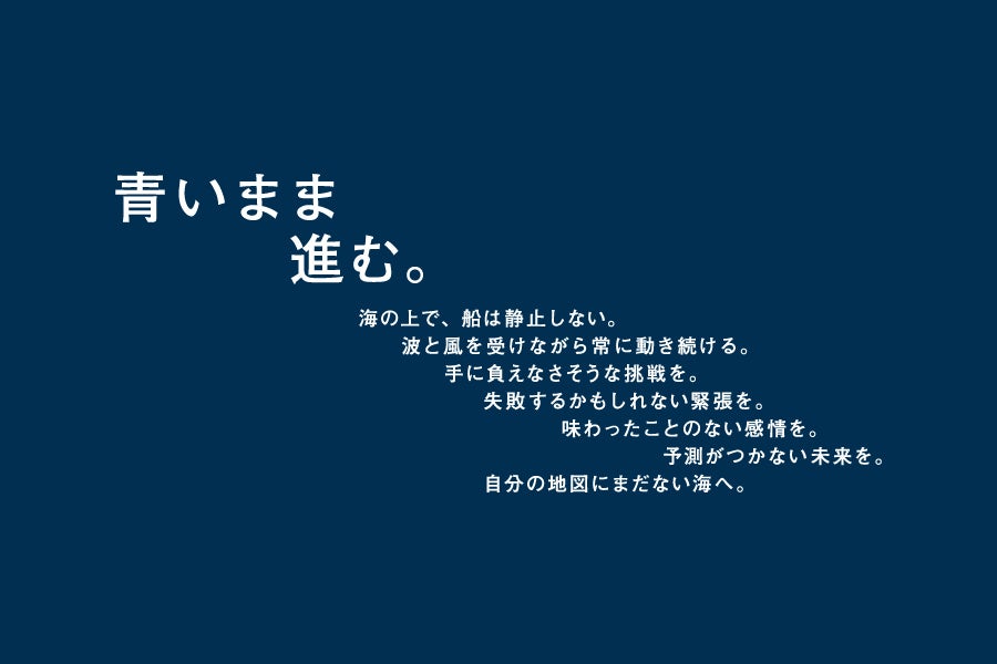 「青」は誠実さや信頼、品格、そして知性を象徴するだけでなく、青春や若葉といった若さや未来をも連想させる色です。シップスは設立以来、変わらぬ想いや姿勢を抱きながら、50年の歴史の中で常に新しい可能性を求めて航海を続けてまいりました。これから先も、シップスを支えてくださるすべての人々と共に、未知なる未来へと挑戦を続けてまいります。その想いを「青いまま進む。」というステートメントに込めています。
