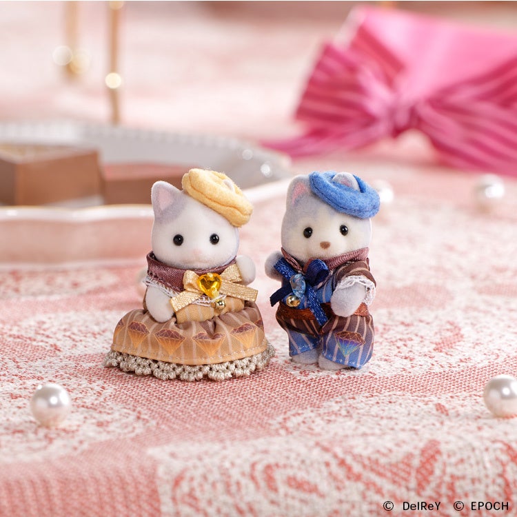 中でも注目は、「シルバニアファミリー×デルレイ ラテネコの赤ちゃん&ハスキーの赤ちゃん -ダイヤモンドショコラ-」。ダイヤモンド型のチョコレートが人気のデルレイ。そんなデルレイのアイコンでもあるダイヤモンド型のショコラをモチーフにした特別なドレスの赤ちゃんのペアセットです。