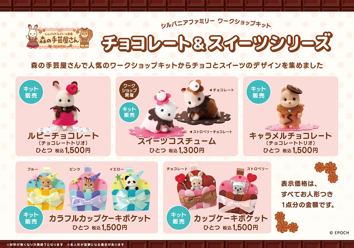 シルバニアファミリーのお洋服や小物が作れる「森の手芸屋さん」オリジナルハンドメイドキットの中から、バレンタインシーズンにちなんだ下記スイーツモチーフのアイテムのほか大人気のキットを多種取り揃えます。