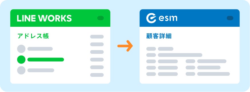 esm(eセールスマネージャー)とLINE WORKSを連携することで、LINE WORKSのアドレス帳データをesmに取り込み、esm上でメッセージ配信やトーク内容の確認が可能となります。