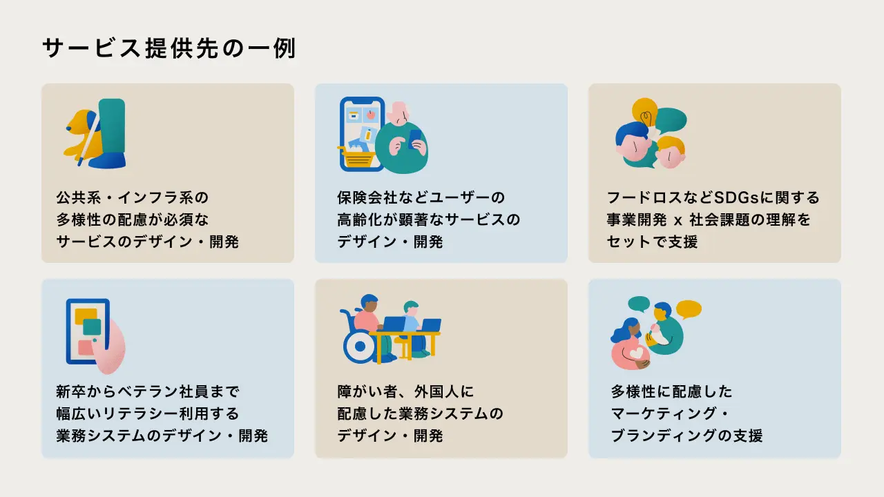 - デザインスタジオCULUMUは、『企業課題と社会課題の解決を共に目指すインクルーシブデザインスタジオ』をビジョンに、高齢者や障がい者、外国人やマタニティなどのリードユーザーとの共創型のデザインにより人に優しいデジタルと事業機会創出に取り組んでおります。