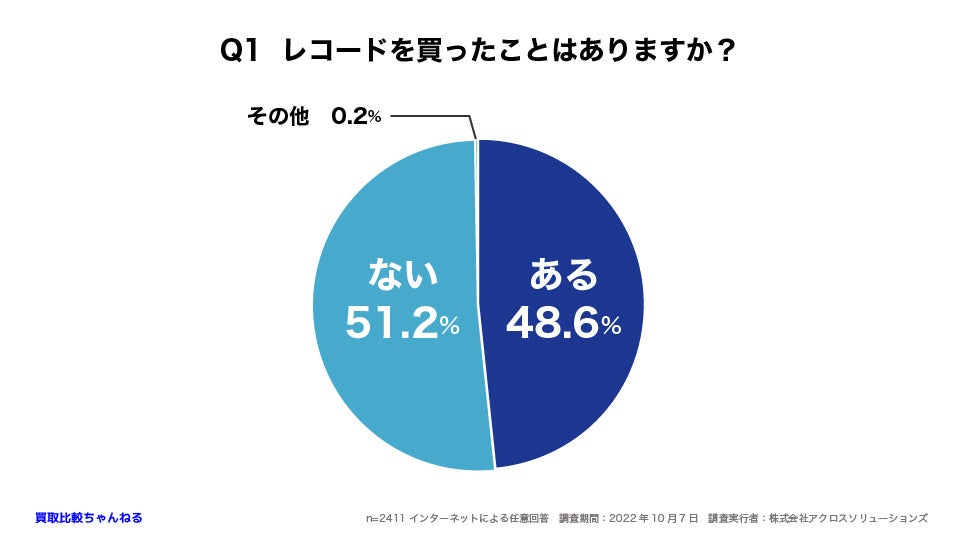 レコードを買ったことがないという人が51.2%、あるという人が48.6%で、約半数に分かれる結果となりました。