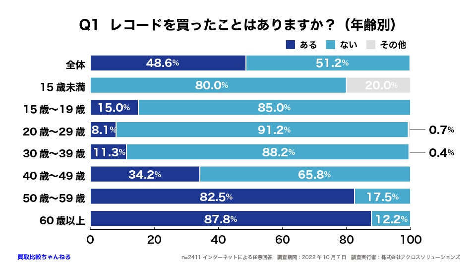 株式会社アクロスソリューションズと株式会社浜屋が共同運営している買取比較ちゃんねる(URL:https://www.hamaya-corp.co.jp/media )は、15歳未満〜60歳以上の男女2411人を対象に「レコードに関する意識調査」を実施しました。