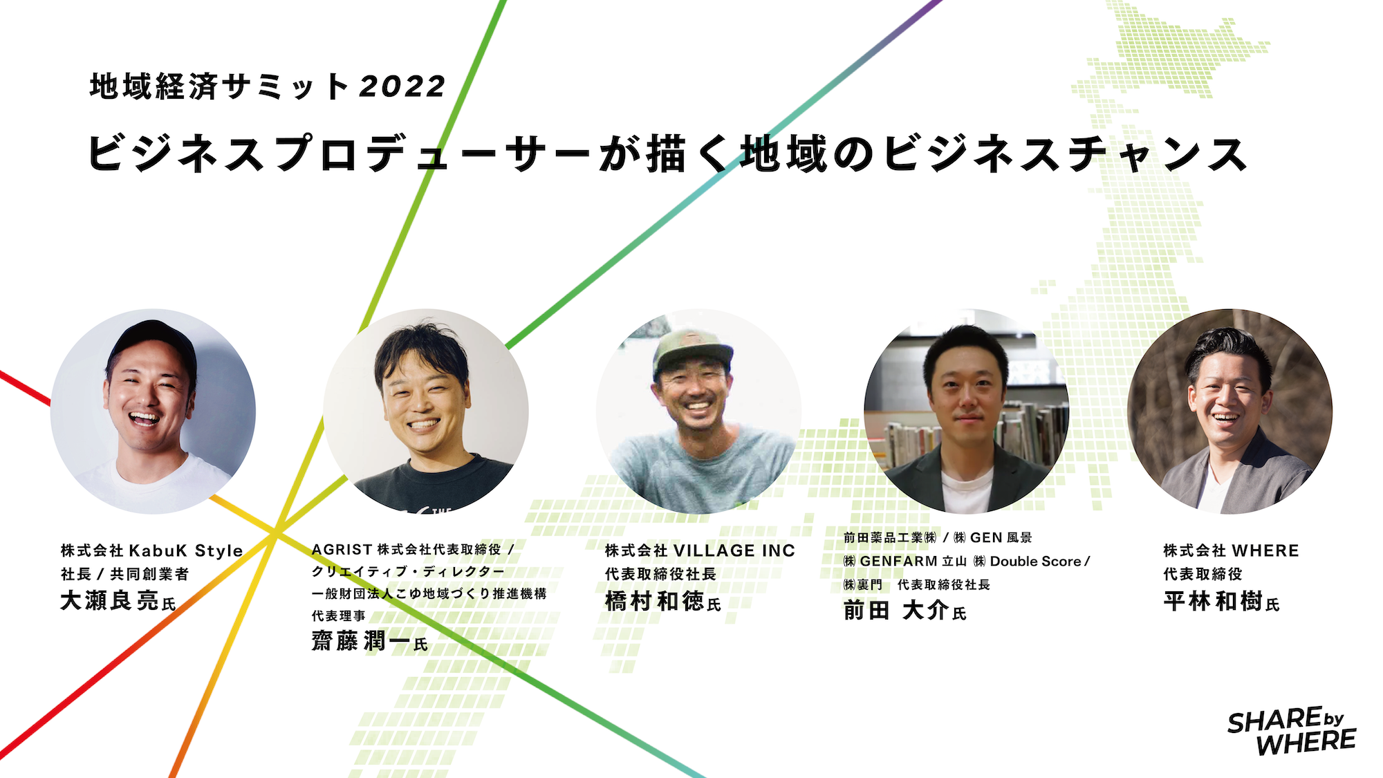 ◉登壇者:大瀬良 亮 氏(株式会社KabuK Style 社長)、齋藤 潤一 氏(AGRIST株式会社 代表取締役)、橋村 和徳 氏(株式会社VILLAGE INC 代表取締役社長)、前田 大介 氏(前田薬品工業(株)代表取締役社長)、平林 和樹 氏(株式会社WHERE 代表取締役)