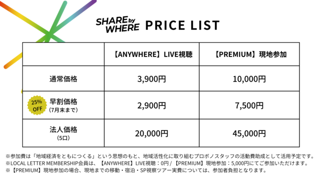 今回の参加費は「地域経済をともにつくる」という思想のもと、地域活性化に取り組むプロボノスタッフ(学生及び社会人)の活動助成費として活用予定です。