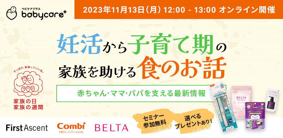 女性の健康のためのサプリメントや赤ちゃんのための離乳食、ママ・パパの食事、便利なベビーグッズの紹介と、食にまつわる幅広いコンテンツを、それぞれの専門家にお話を頂くセミナーです。学びあるコンテンツと豪華プレゼントをご用意しておりますので、ぜひご参加ください。