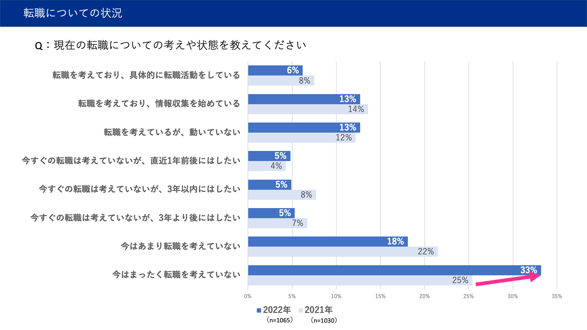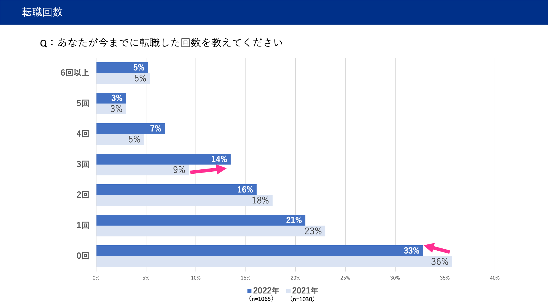 「2022年は前年と比べて、副業率が5pt低下しましたが、その代わりに転職回数が増加しました。この結果より、転職して副業をやめたり、副業から正社員に転職する人が増加したのではないかと推測されます。