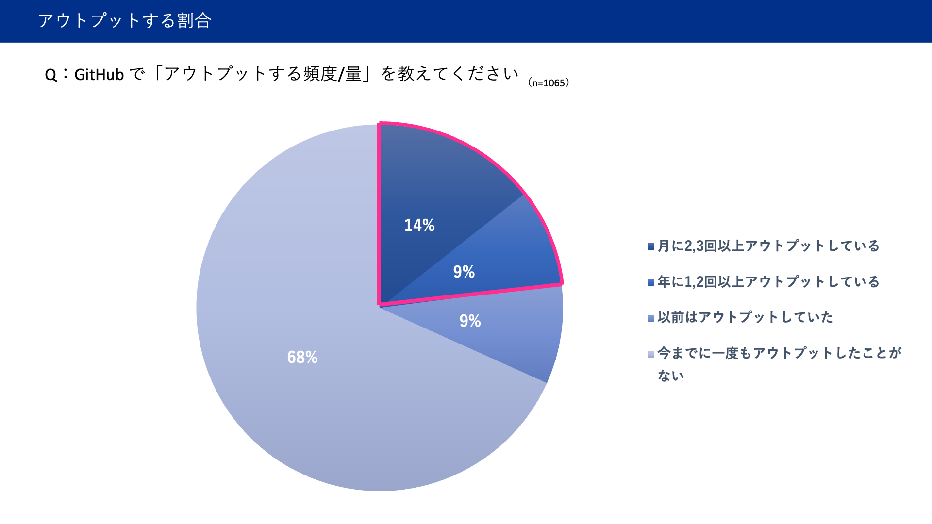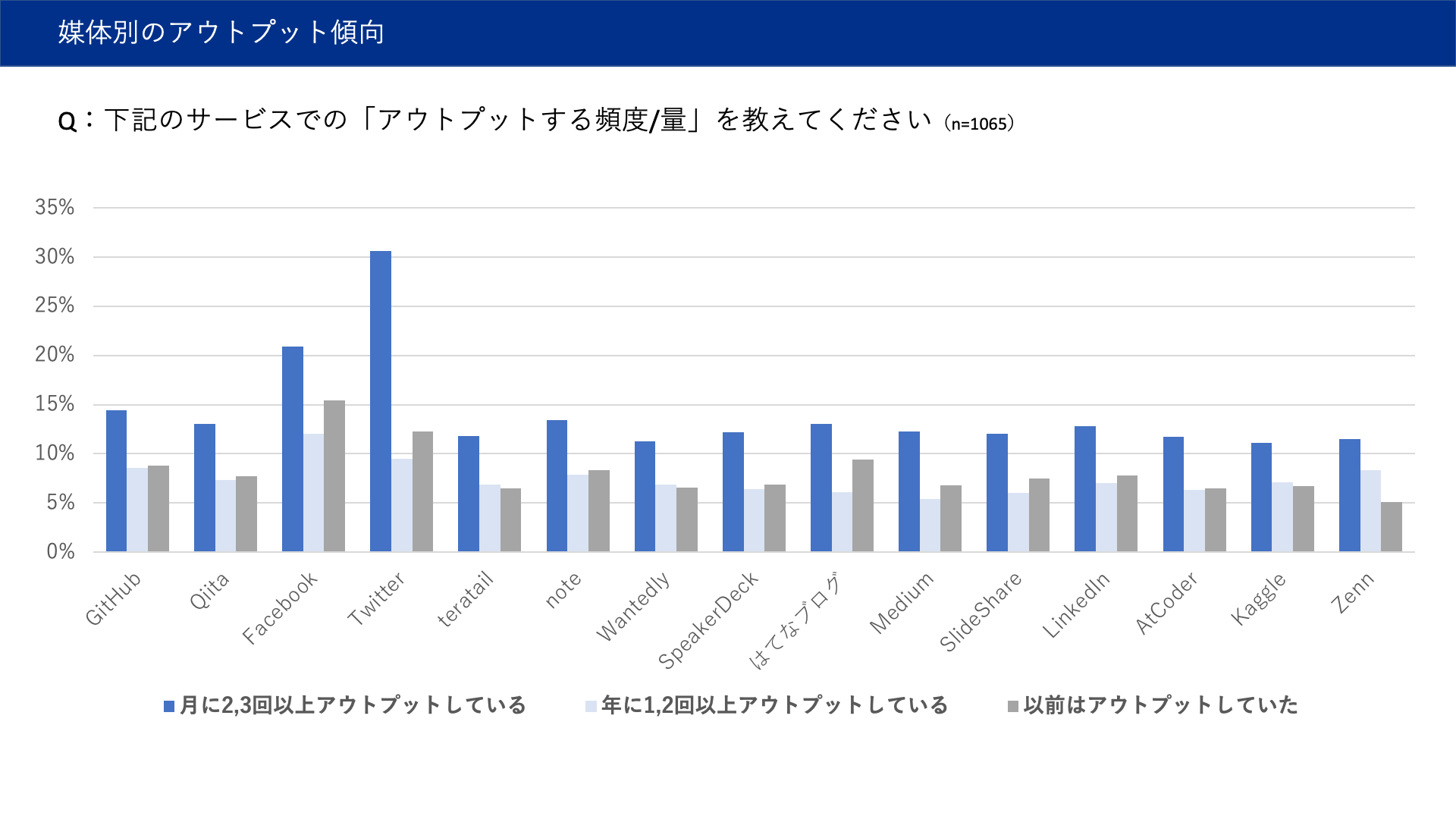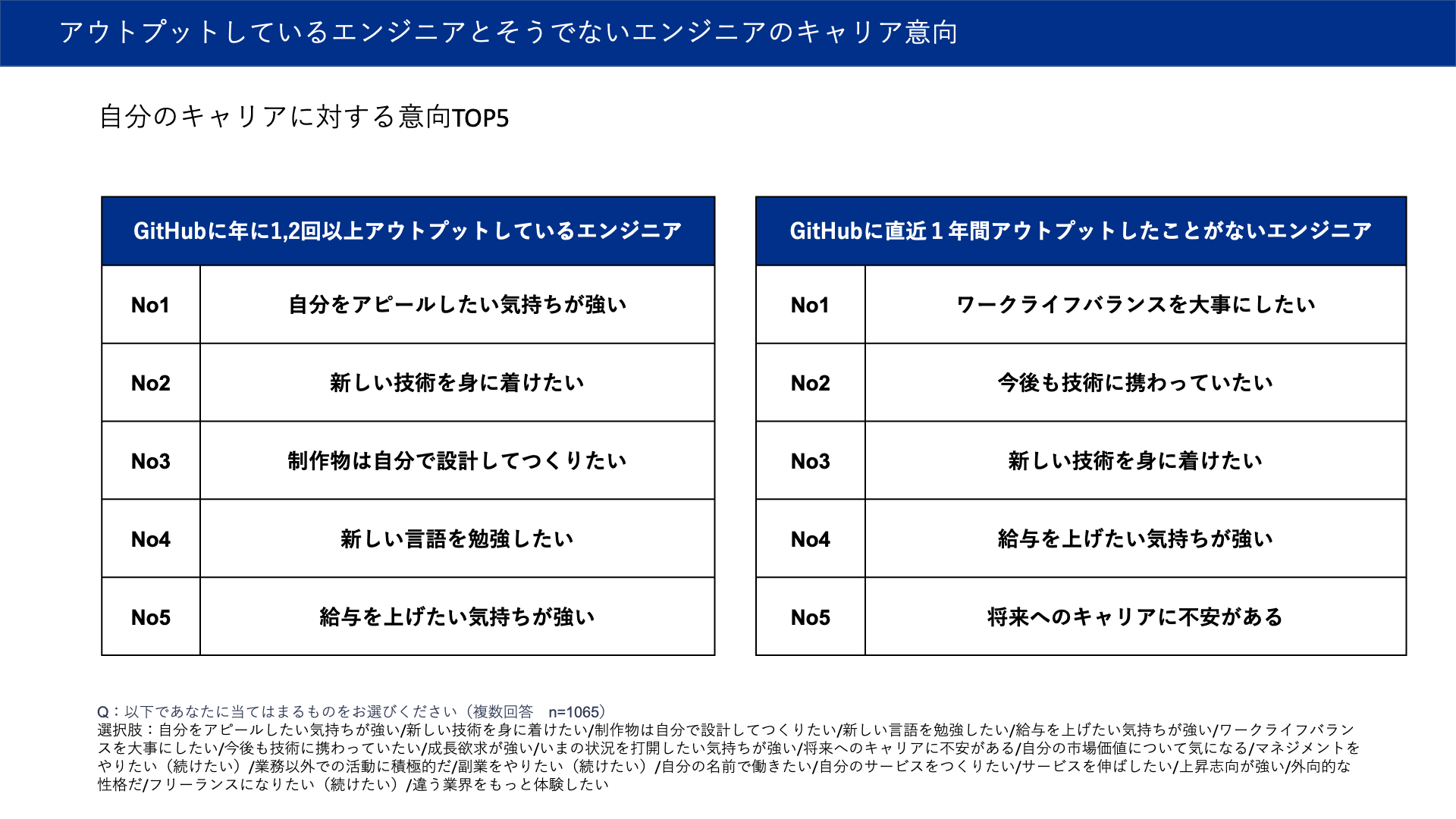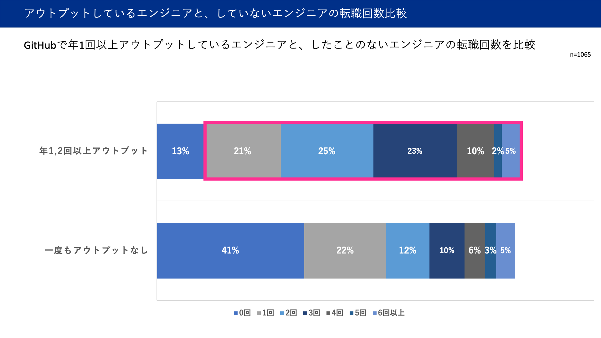 また、Web上にアウトプットをしているエンジニアと、していないエンジニアとでは、副業率、転職回数に差が表れていました。こちらも推測の域を出ませんが、たとえば、アウトプットをしている方はそれを通じてより多くのキャリアの機会を得ているのかもしれません。
