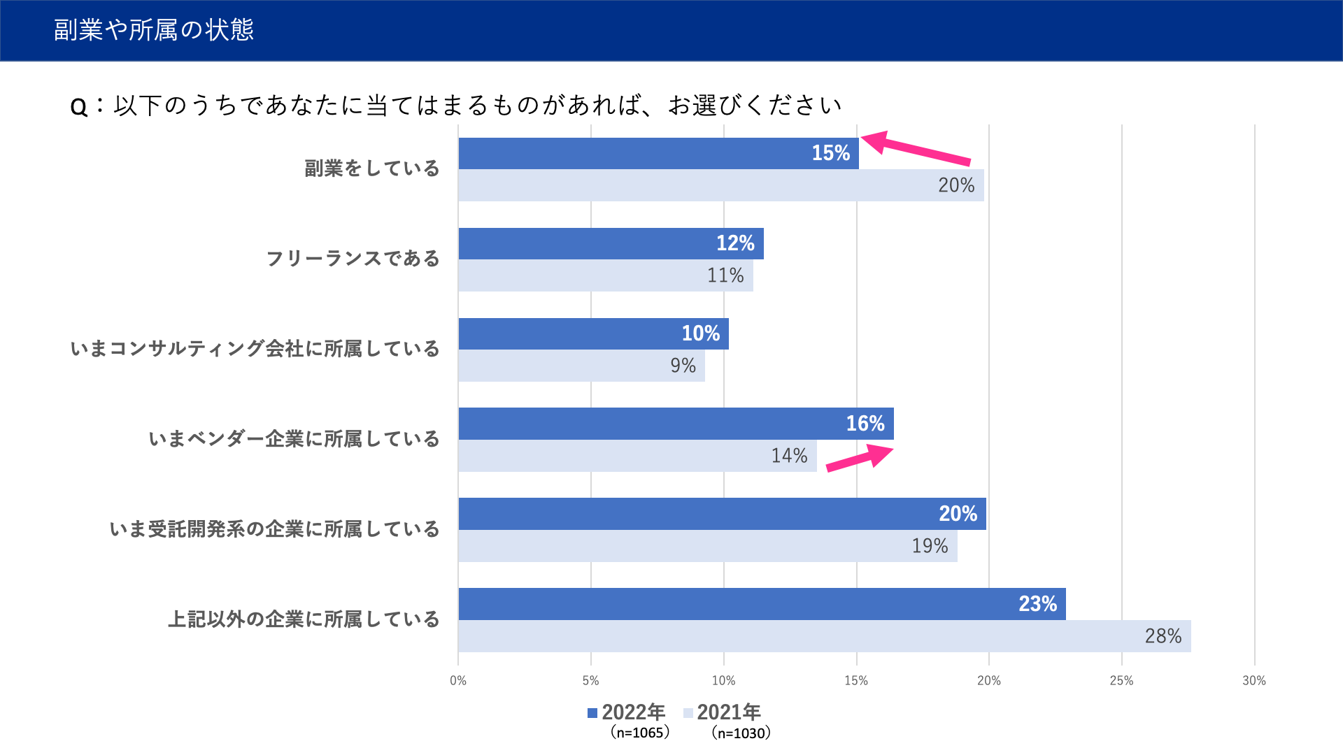 【エンジニア約1000名にキャリアアンケート調査】副業率は前年よりも低下し、転職回数が増加、エンジニアの3人に2人は転職経験あり