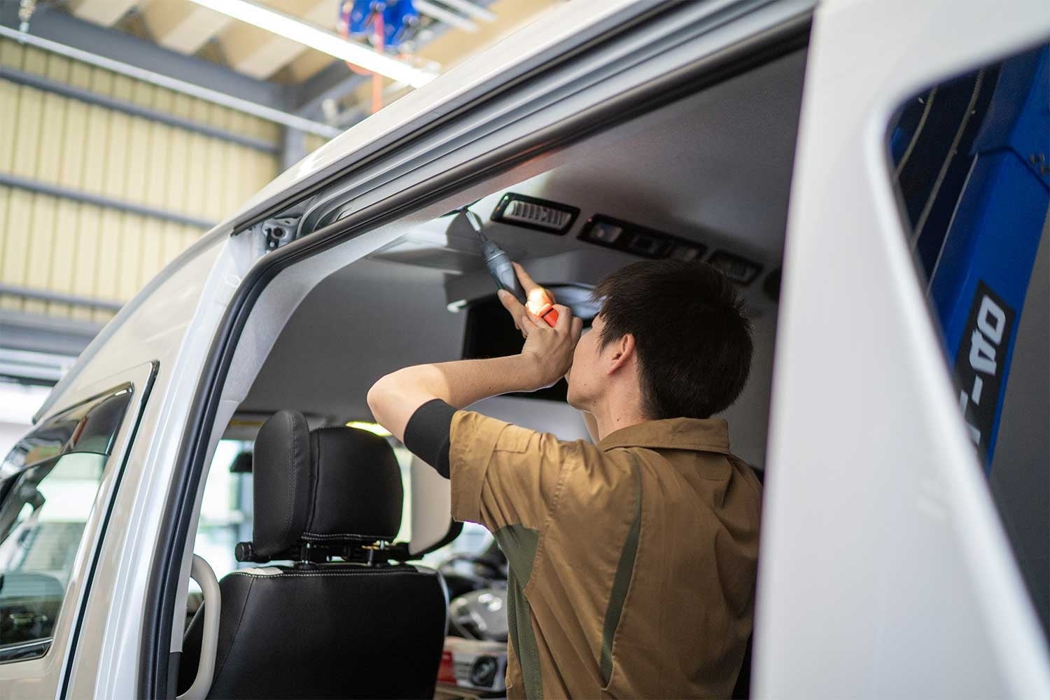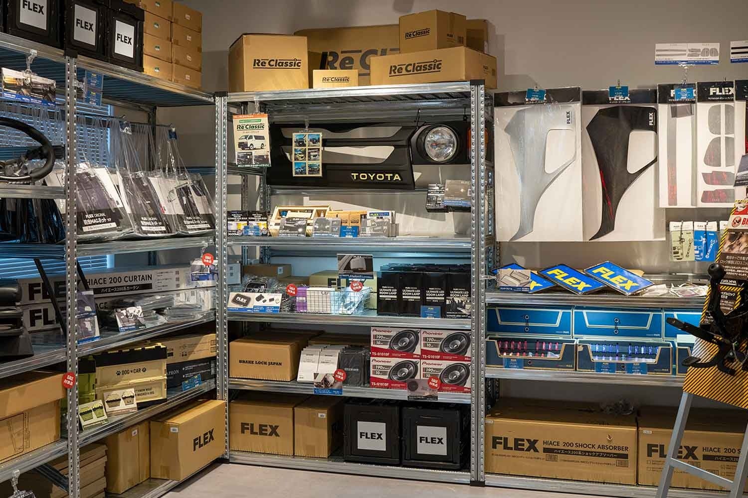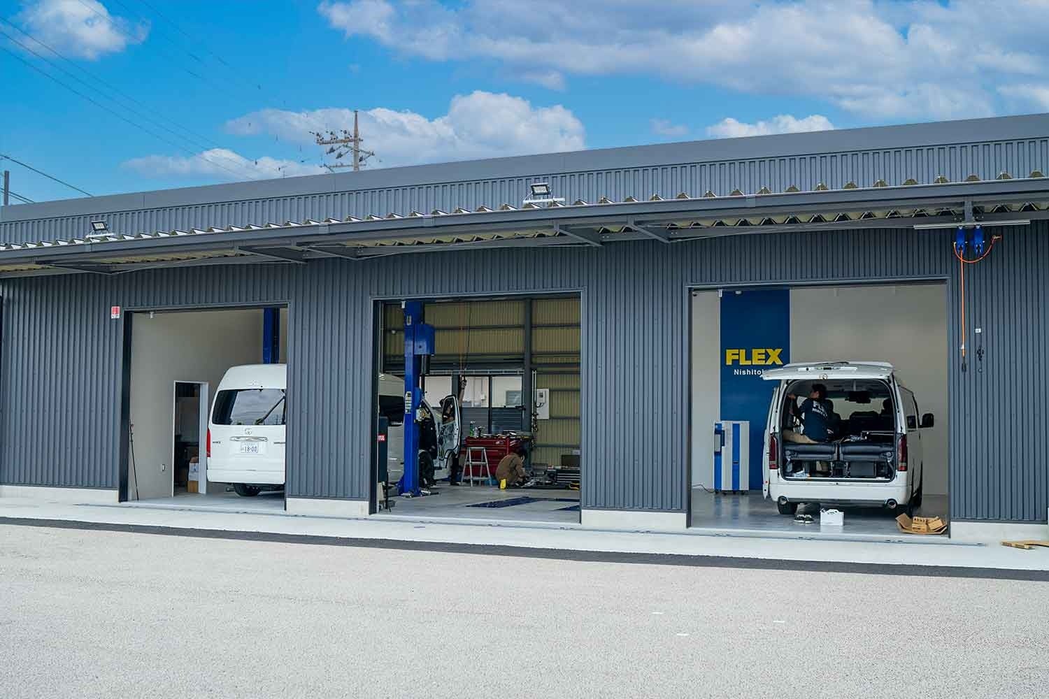 新店舗には車検に対応した認証整備工場を併設。また最新の設備を揃えているため、幅広いカスタムに対応することが可能です。車検や整備点検、カスタムパーツの取付など、ハイエースに関するあらゆる作業をお任せください。ハイエースのエキスパートであるフレックスの自動車整備士が、豊富な経験と熟練の技を駆使して最高の一台に仕上げます!