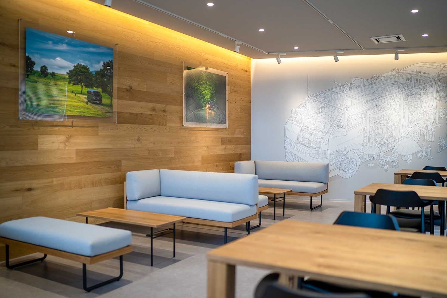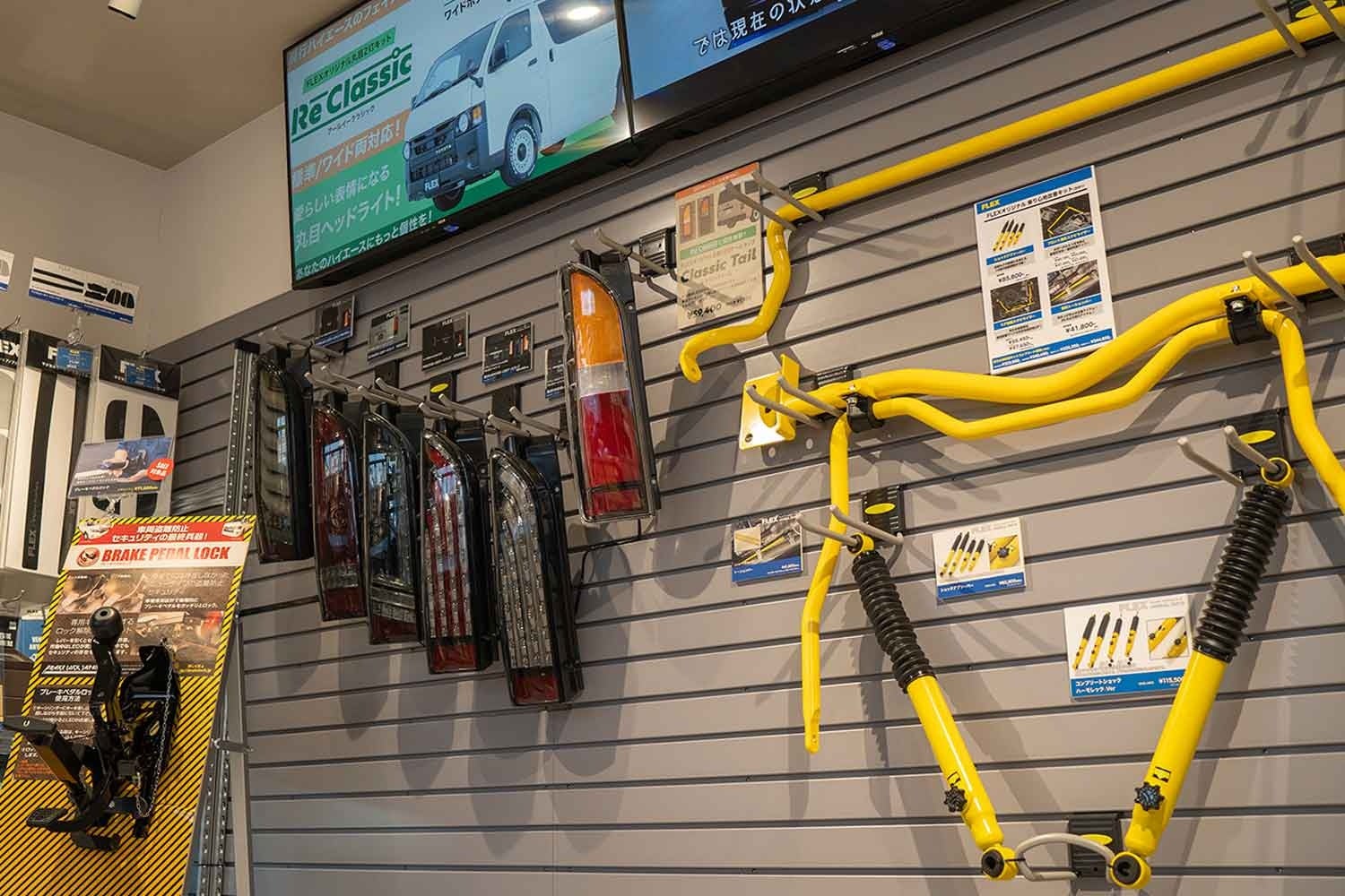 新店舗では車両の展示スペースを拡大。新車や良質な中古車、コンプリート車両などを心ゆくまでご覧ください。またカスタムパーツも数多く展示しておりますので、ハイエースをお好みのスタイルにカスタムしていただけます。