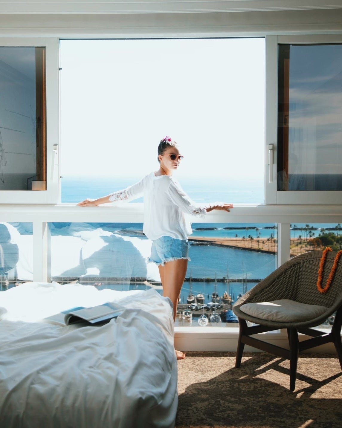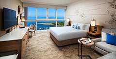 全室オーシャンフロントの客室。海や砂をイメージした落ち着いたカラーのナイオの花を描いたモダンな雰囲気のお部屋です。