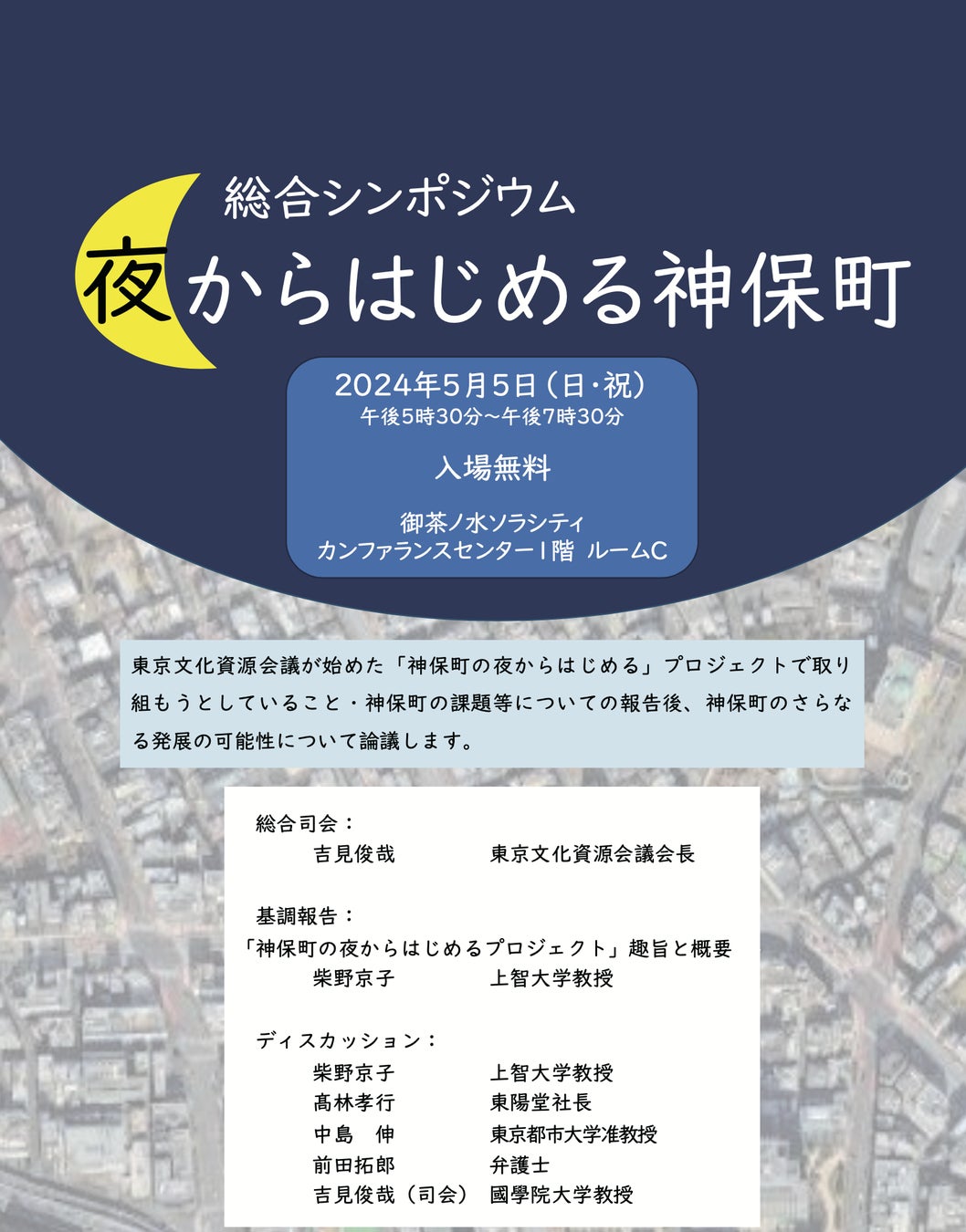 東京文化資源会議がこの立ち立ち上げた「神保町の夜からはじめる」プロジェクトで取り組もうとしていること、神保町の課題等についての報告後、神保町のさらなる発展の可能性について論議するシンポジウムです。基調報告後、有識者らによるパネルディスカッションを行います。