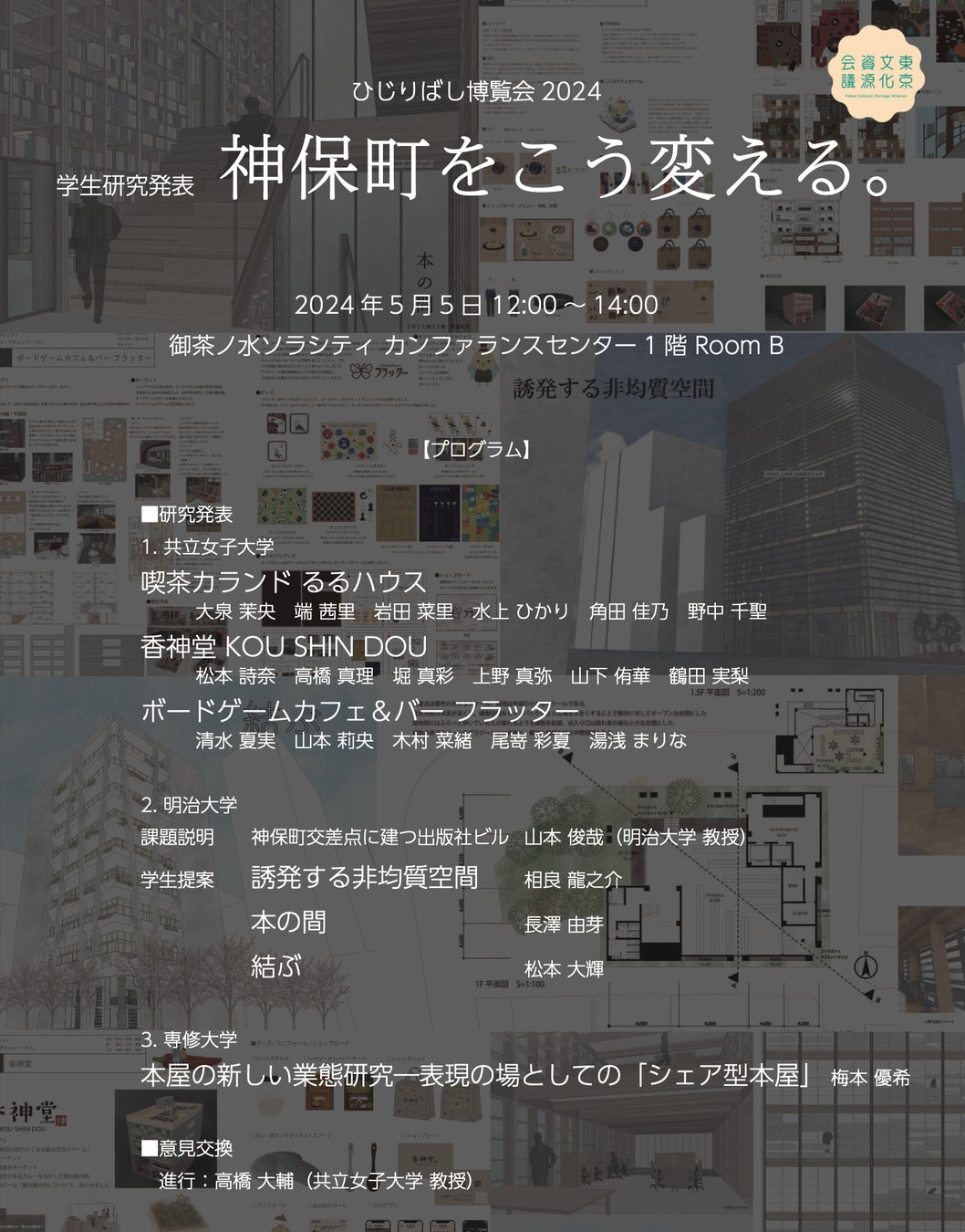 専修大学、共立女子大学、明治大学など、神保町近隣の大学生らによる研究発表会です。それぞれの視点から、神保町の新たな楽しみ方や可能性について発表いただきます。