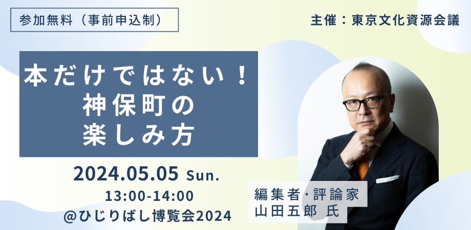 基調講演として、編集者・評論家の山田五郎氏をゲストに、「本だけではない神保町」と題した講演をいただきます。古今東西あらゆる文化や都市の魅力について造詣の深い山田五郎氏ならではの視点から、神保町のさらなる面白さについて語っていただきます。