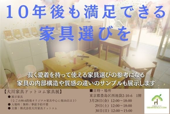 株式会社大川家具ドットコム(代表:堤太陽、本社:福岡県大川市)は、2025年3月28日(金)~30日(日)の3日間、東京都池袋にて「長く愛せる家具展」を開催します。日本製の高品質な家具を実際に見て、触れて、確かめられる特別なポップアップイベントです。