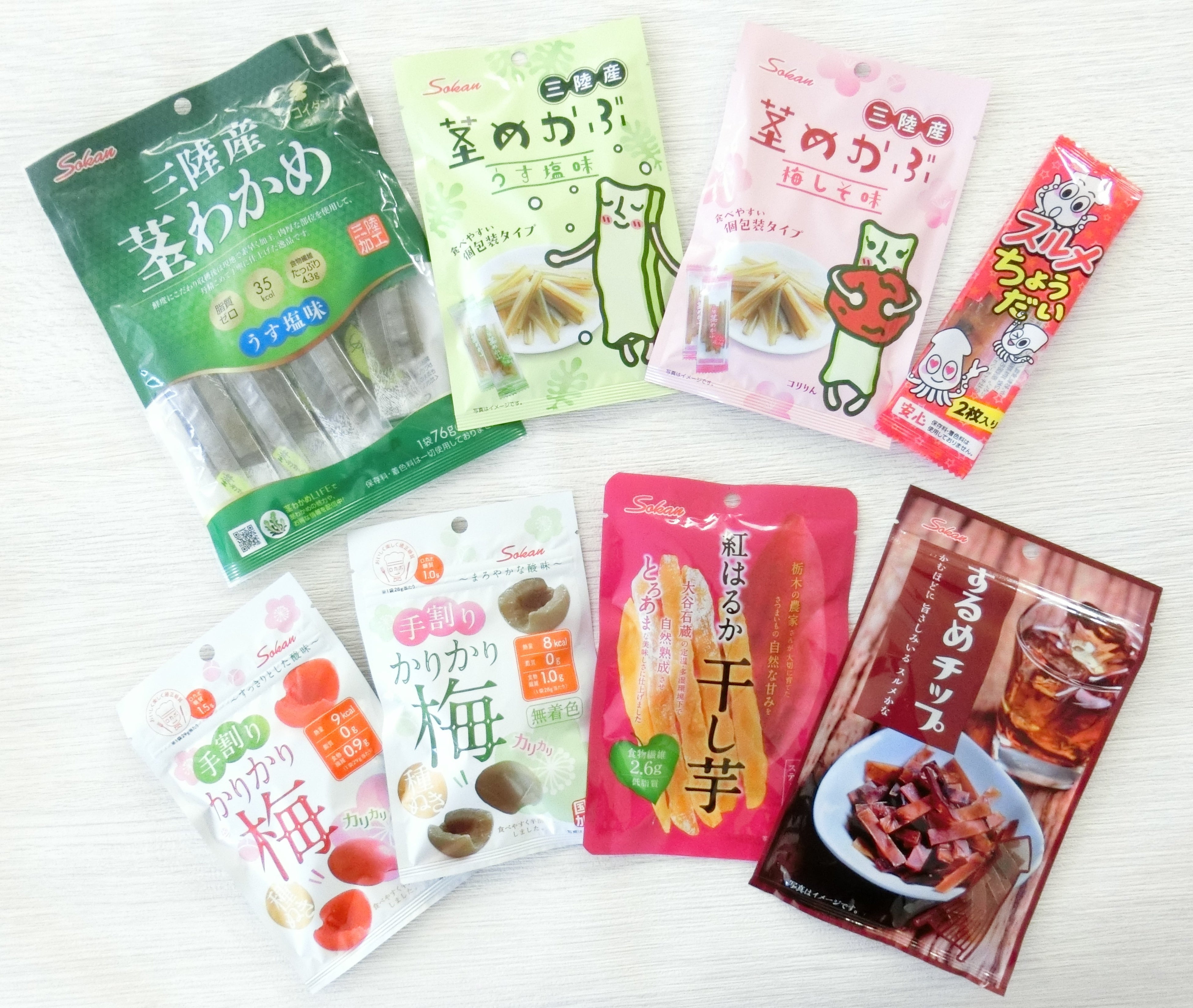 ゆーぽんさんに選んでいただいたオリジナル商品BOX。茎わかめや茎めかぶだけでなく、お気に入りのカリカリ梅が2種類入っています。味わい深いするめチップは大きめパックで、ちょっとした小腹満たしにおすすめです。