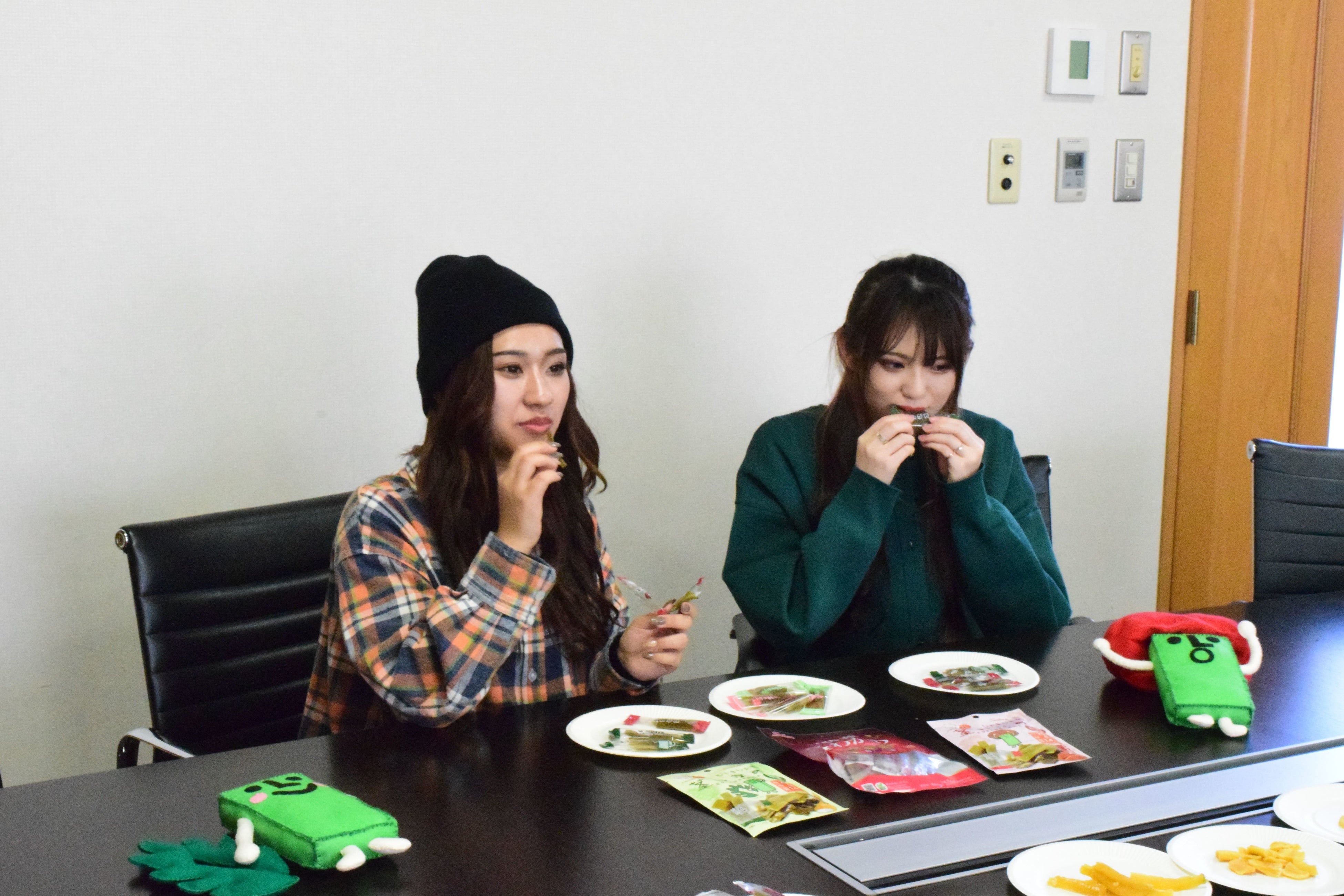 茎わかめアンバサダーのお二人には壮関へ来社いただき、工場見学や座談会に参加いただきました。お二人とも普段から、小腹が空いた時、食欲が出ない時など、茎わかめやカリカリ梅をご家族で召し上がっていただいているとのことです。茎わかめだけでなく、茎めかぶやドライフルーツなども「美味しい!」と試食していただきました。
