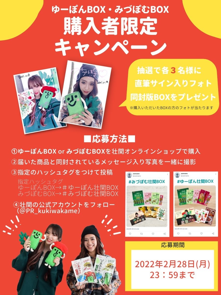 「ゆーぽんBOX」もしくは「みづぽむBOX」を購入いただいた方の中から、抽選で合計12名様に、茎わかめアンバサダー直筆サイン入りフォトをプレゼント。購入いただいた商品と、各BOXに同封されているメッセージ入りフォト用紙を一緒に撮影し、指定のハッシュタグ「#ゆーぽん壮関BOX」もしくは「#みづぽむ壮関BOX」をつけて、ご自身のTwitterもしくはInstagramにて投稿してください。壮関アカウントのフォロワー様にご参加いただけるキャンペーンです。