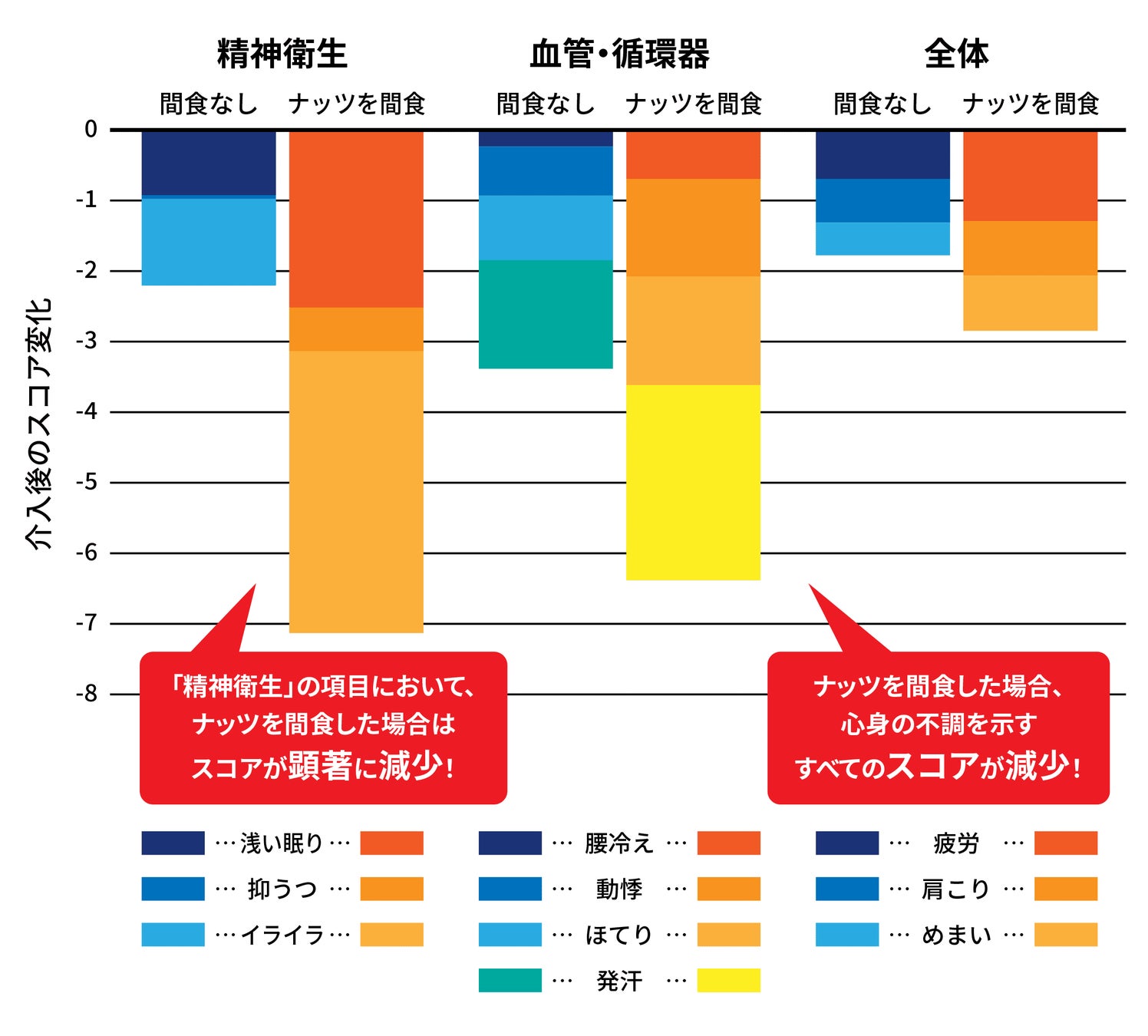 ナッツの間食は、全体的に心身の不調を示すスコアが減少。