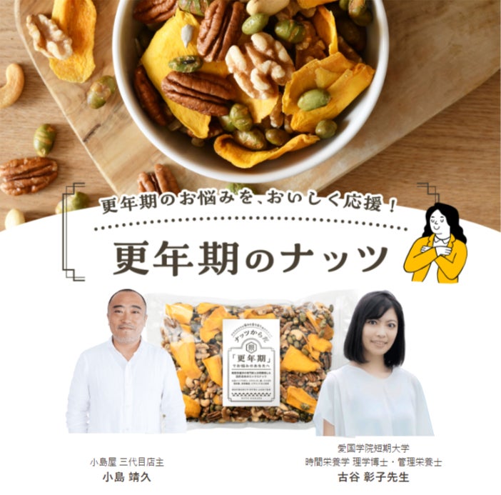 ナッツ専門店 小島屋 が 一人ひとりを本気で考えた あなたの体に良いナッツ「ナッツからだ」シリーズを販売します。シリーズ第一弾商品は更年期の悩みを応援する「更年期のナッツ」