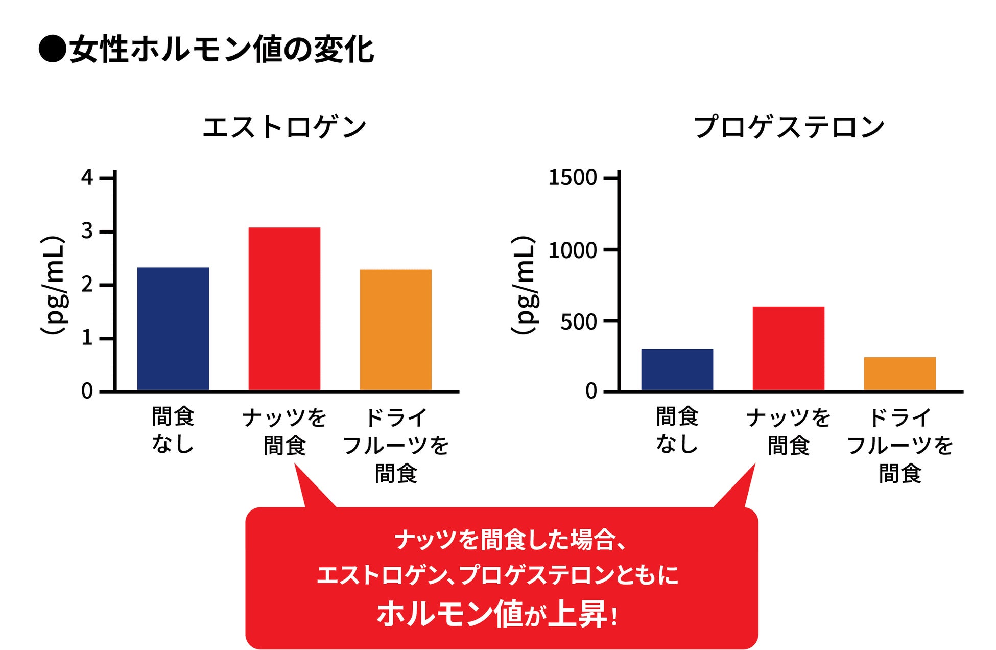 間食にドライフルーツを食べた場合は、ホルモン値の変化はほとんど見られませんでしたが、ナッツを間食した場合は、2つの女性ホルモンである「エストロゲン」、「プロゲステロン」ともにホルモン値の上昇が見られました。