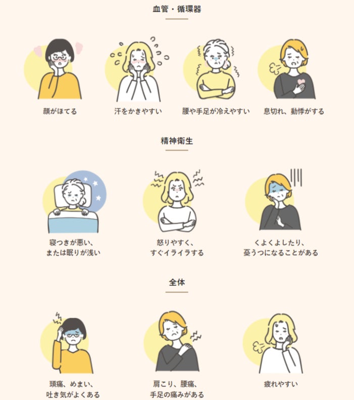 卵巣から分泌される女性ホルモン、「エストロゲン」と「プロゲステロン」が徐々に減少し更年期が始まります。その症状は多岐にわたりますが、一般的に以下のものが挙げられます。