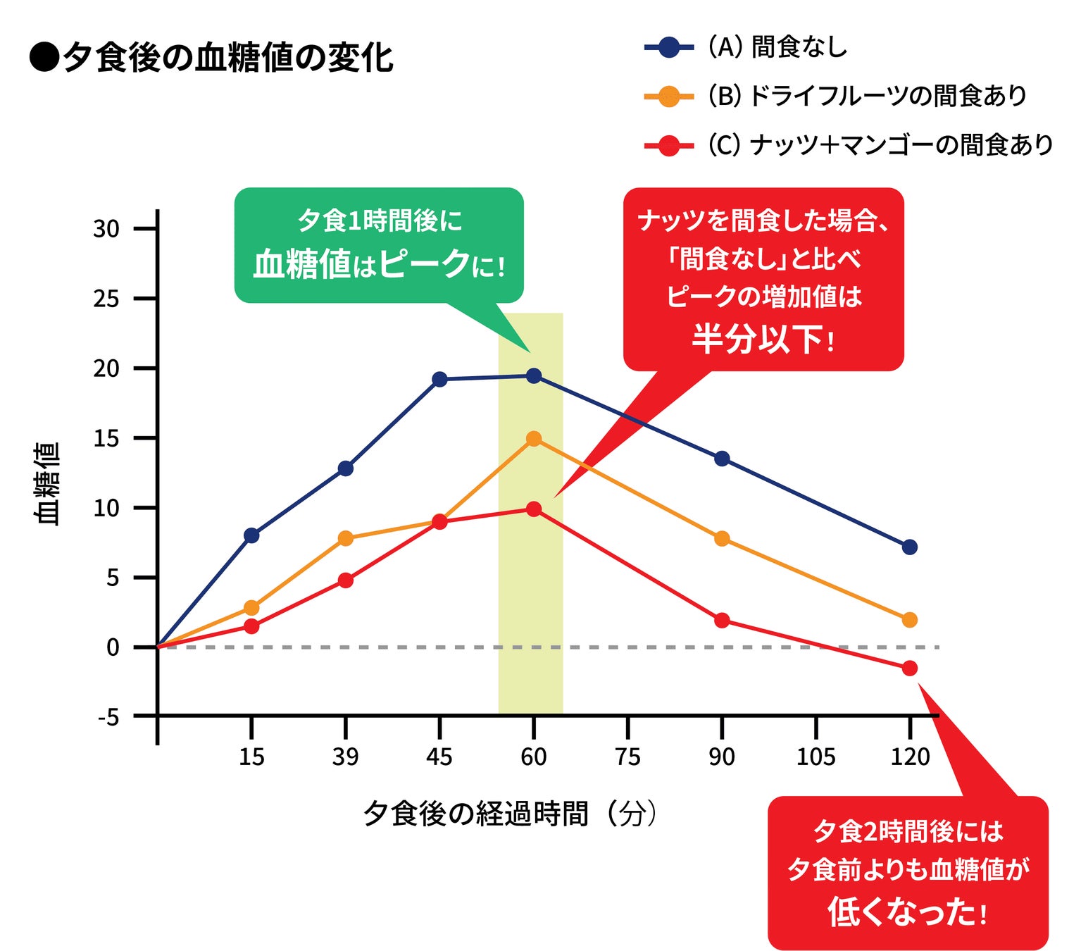 その結果、(A)〜(C)いずれも、夕食1時間後に血糖値はピークになりました。特に、「(C)ナッツ+マンゴーの間食あり」場合は、「(A)間食なし」と比較して、ピークの増加値は半分以下という結果がでました。また、「(C)ナッツ+マンゴーの間食あり」の場合、夕食2時間後には、夕食前よりも血糖値は低くなりました。