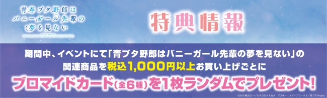 期間中に対象商品1,000円(税込)ご購入毎に、ブロマイドカード(全6種)をランダムでプレゼントいたします。「青ブタ」ファン注目のフェアに、ぜひご期待くださいませ!!