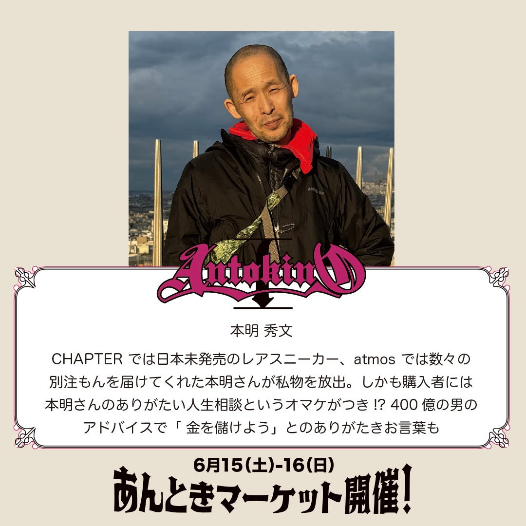 CHAPTER では日本未発売のレアスニーカー、atmos では数々の別注もんを届けてくれた本明さんが私物を放出。しかも購入者には本明さんのありがたい人生相談というオマケがつくとか、つかないとか。まぁ、この辺は当日の気分次第。貴重な私物と共に、400億の男のアドバイスで「 金を儲けよう 」とのありがたきお言葉も