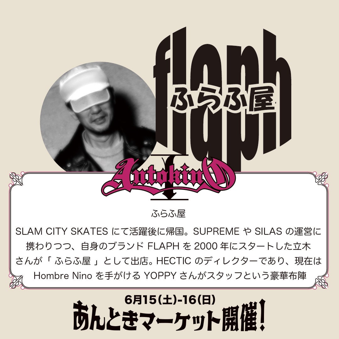 ロンドンの SLAM CITY SKATES にて活躍した後に日本へ帰国。SUPREME や SILAS の運営に携わりつつ、自身のブランド FLAPH を2000年にスタートした立木さんが「 ふらふ屋 」として出店。スタッフは HECTIC のディレクターであり、現在は Hombre Nino を手がける YOPPY さんという豪華布陣