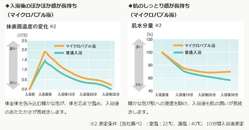 毛穴の奥まで入り込む微細な泡が湯全体に広がることで、保温効果、保湿効果を得ることができます。また、なめらかなシルクのような肌触りの白濁した湯に全身が包まれることで、まるで温泉につかっている様な贅沢な気分をお楽しみいただけます。