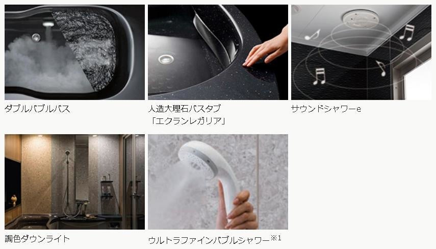また、「ダブルバブルバス」とともに、入浴時間をより楽しむ機器「サウンドシャワーe」、「調色ダウンライト」と、入浴感を高める高級人造大理石バスタブ「エクランレガリア」を標準装備した、「コンフォートライフ」と「アーバンライフ」の2グレードを、YUNO(ユーノ)にラインナップします。